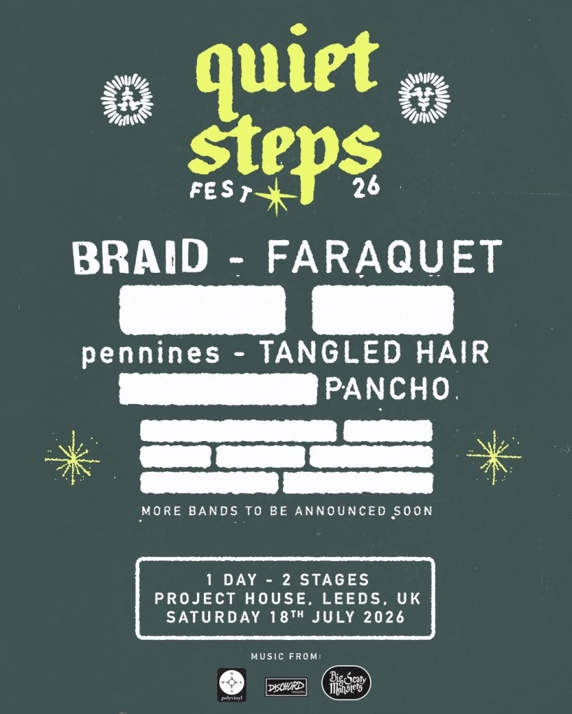 The inaugural edition of Quiet Steps Fest will take place on 18th July from Armley Road’s Project House with a lineup split across two stages that boasts Champaign emo veterans Braid, newly revived Washington post-hardcore luminaries Faraquet, British math rock fixtures Tangled Hair and pennines and burgeoning Delta Sleep and TTNG offshoot project Pancho as initial recruits. With further performers yet to be announced the festival’s programme draws upon twenty years of experience booking live concerts that has seen Dirty Otter play host to the likes of American Football, Blakfish, Brontide, City Of Caterpillar, Joan Of Arc, Marnie Stern, mewithoutYou, Pinback, Pneu, So Many Dynamos, Tera Melos, That Fucking Tank, Three Trapped Tigers and Tubelord since their inception in 2006. Tickets for Quiet Steps Fest 2026 will be available to purchase from 23rd January at 10am.