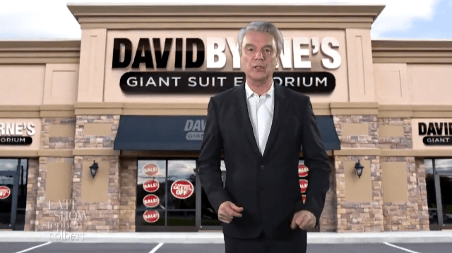 Watch David Byrne’s Giant Suit Emporium ad As well as a barefoot performance of the lead single from his new album on The Late Show with Stephen Colbert.